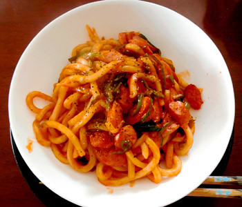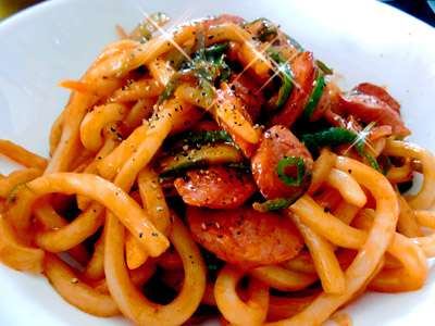 うどんを入れて、更に思い付きでケチャップ味のナポリタン風に