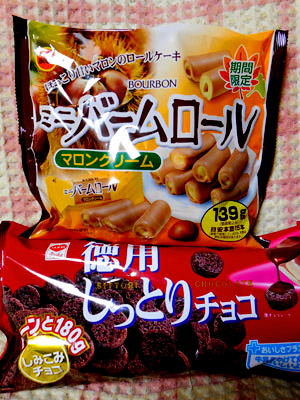 期間限定のマロンバームロールと、徳用のしっとりチョコ。
