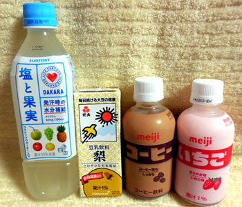 DAKARA 塩と果実、紀文 豆乳飲料 梨、meiji コーヒー&いちご。