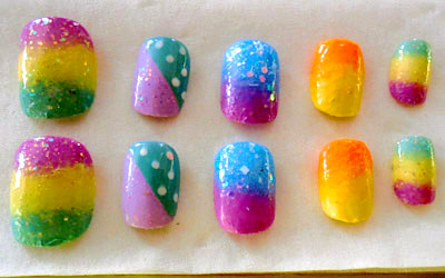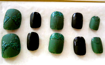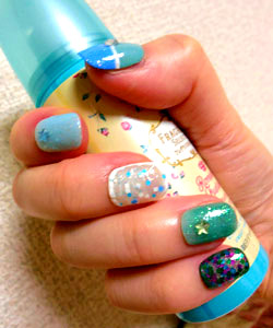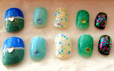 親指は青と緑のバイカラーに、真ん中に銀のハートのパーツでアクセント。