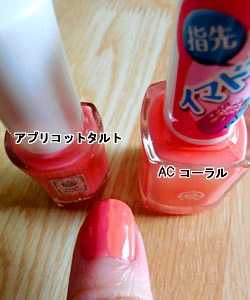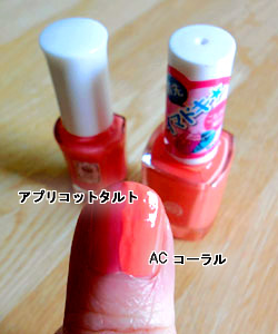 アプリコットタルトは赤みがあり、コーラルはよりオレンジ寄りのピンク。