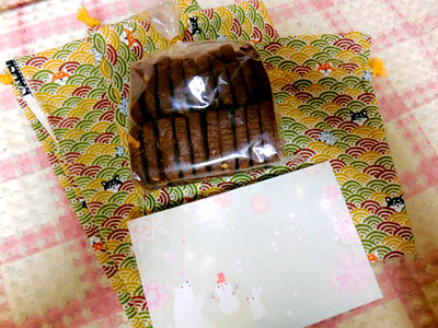 また美味しいクッキーと、大きさの異なるお揃いの巾着2つ頂いた。